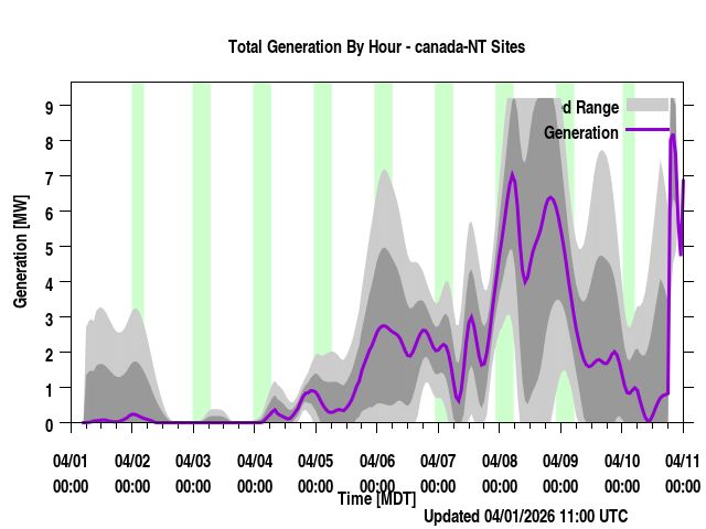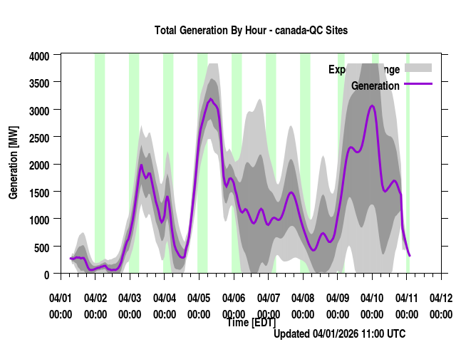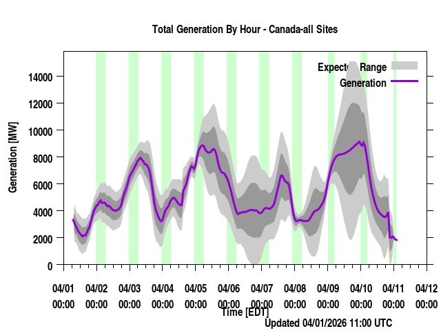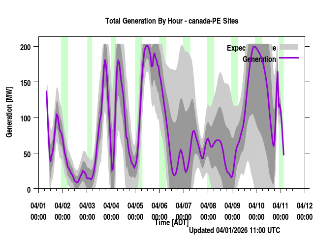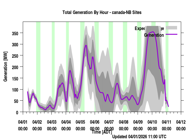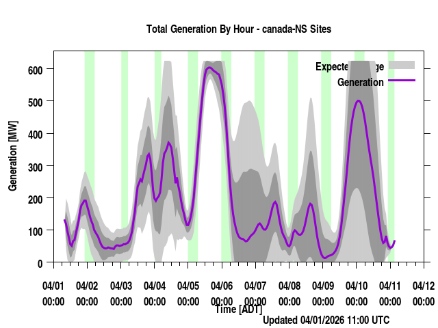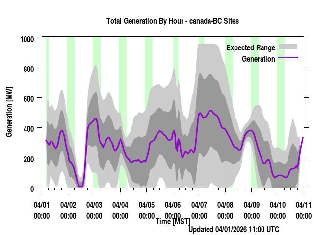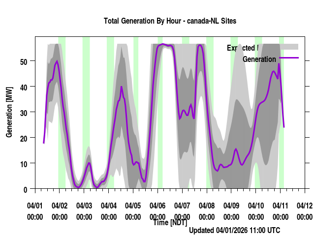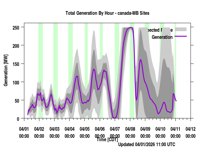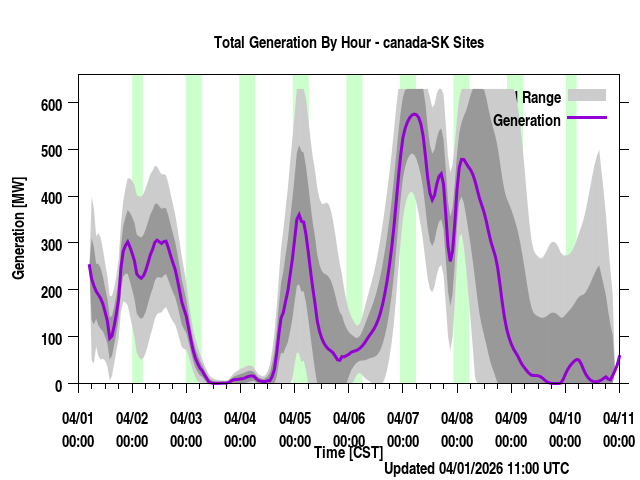 Where REGION is a province or power region, contain the total generation forecast for that region (the sum of the individual farm output for that region). Times are listed in local prevailing time (for regions that span a time zone, the time zone most of the wind farms are in are used) as well as UTC time. The forecast generation is given along with a "generation_upper" and "generation_lower" values. These are plus/minus one standard deviation from the forecast. "generation_BC" is a bias corrected version of the forecast if applicable. Presently, none of the regions have bias corrected values (though we have done this at times in the past) and so those will always be identical to the generation values.
